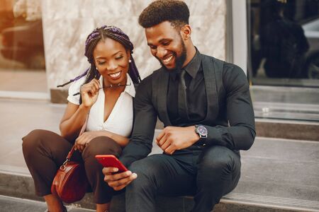 African american male and female influencer posting message with mobile phone outdoor in city in summer