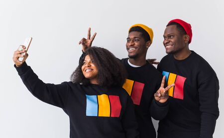 Friendship and fun concept - Group of friends afro american men and woman taking selfie in studio on white background.