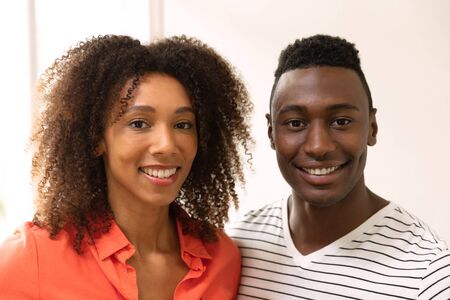 Portrait of an African American couple at home, smiling to camera.