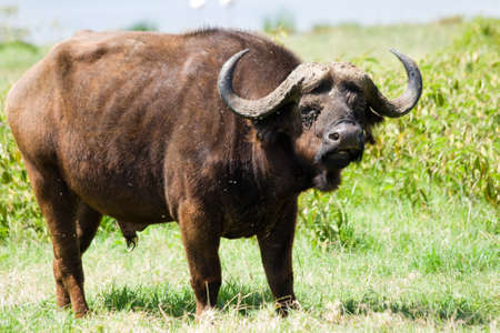 Picturesque buffalo resting in the grass of the savannah. The famous African Big Five. The shores of Lake Nakuru in Kenya