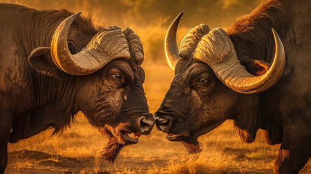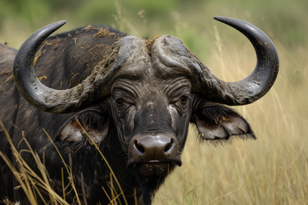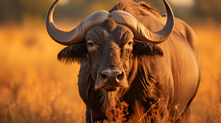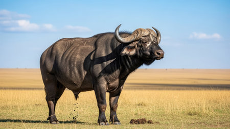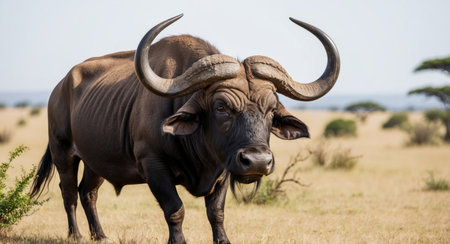 Powerful african cape buffalo stands in golden savanna grass, looking directly at the viewer. large dark skinned animal with massive horns under a clear blue sky, embodying strength and wilderness.