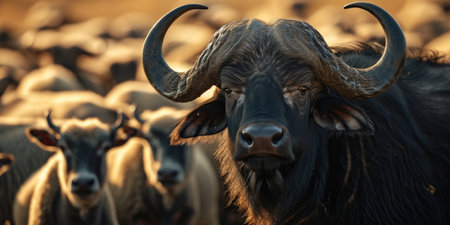 Buffalo herd in the grassland at sunset. Wildlife scene from Africa.