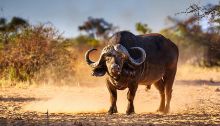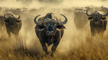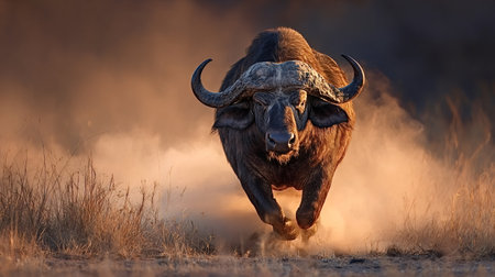 African buffalo charging towards the camera across dusty savanna at golden hour, powerful and majestic, kicking up clouds of dust in a dramatic wildlife moment