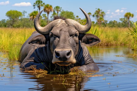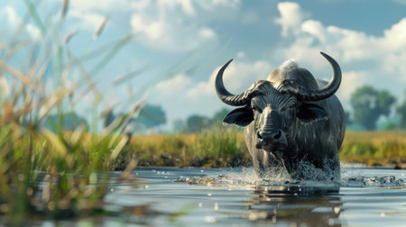 Water buffalo wading through a biodynamic farm marsh, efficient farm work and natural habitat.