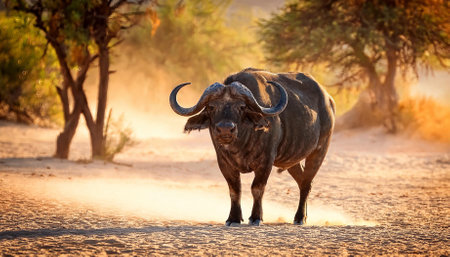An African buffalo stands in a savanna setting, with dust particles highlighted by the sun. The image showcases the animal's dark silhouette against a backdrop of golden grasses and trees. This photo could be used for wildlife publications, educational resources, or advertising materials.