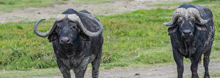 Panorama of two buffalos looking to the camera, Ngorongoro Conservation Area, Tanzania