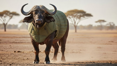 African buffalo in a warm quilted jacket standing on a dusty plain in the savanna. Wildlife fashion and animal protection concept.