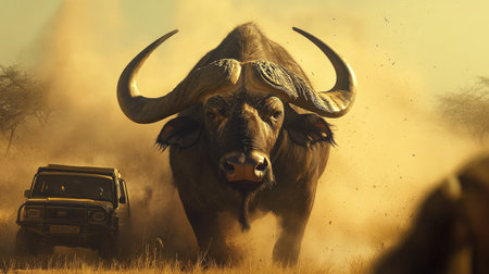 A powerful African buffalo stands its ground against a safari vehicle, creating a dramatic scene filled with dust and the wild beauty of nature in Africa.
