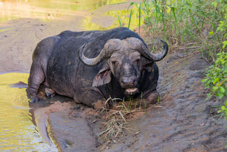 African buffalo or Cape buffalo (Syncerus caffer) in a dry swamp