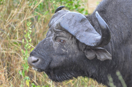 A horizontal closeup shot of an African buffalo (Syncerus caffer) side profile/African wildlife