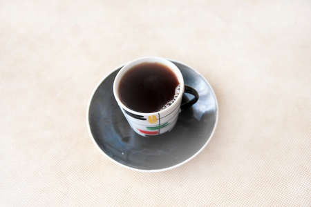 Coffee cup with saucer and spoon on vintage wood surface. Copyspace. Selective focus.