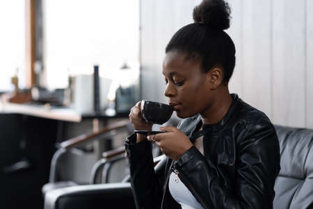 close-up. Young calm black woman relaxing while sitting on a black sofa and drinking coffee from a black mug. Happy african american woman relaxing and drinking coffee