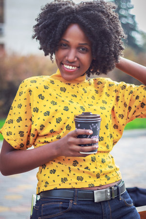 beautiful african american girl with takeaway coffee cup in hands on yellow background
