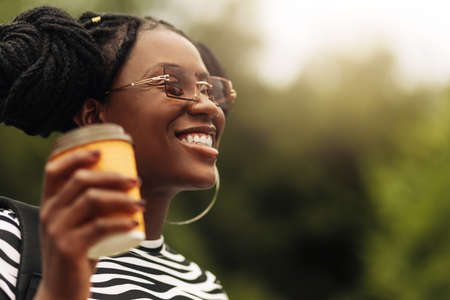 Stylish happy african young woman, wearing sunglasses, holds coffee in takeaway glass, outdoors in city