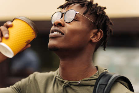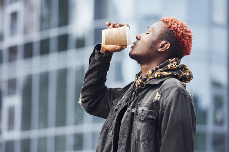 Taking a break and drinking. Young african american man in black jacket outdoors in the city standing against modern business building