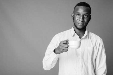 Two young black men with dark skin holding coffee cups and smiling together in casual clothing on white background. Friendship, relaxation and positive mood indoors.