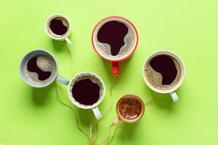 Americano in the different cups on the pink background. Flat Lay, cheerful day concept. This image could be used to show coffee break time or morning as a part of working day and maintaining distance during the coronovirus pandemic