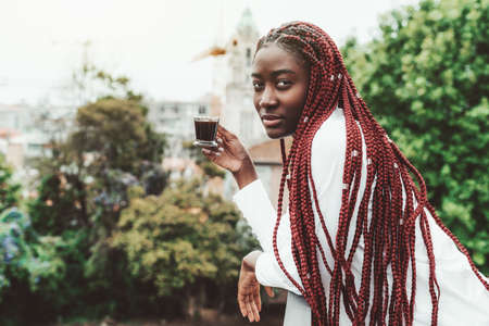 A black woman with red braids on the balcony holding a cup of coffee, blurred trees and buildings in the background. A seductive African female wearing a white dress shirt, looking at the camera