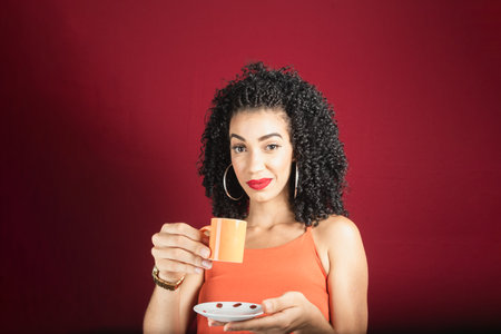 Portrait of young beautiful woman drinking coffee from a cup. Isolated red background.