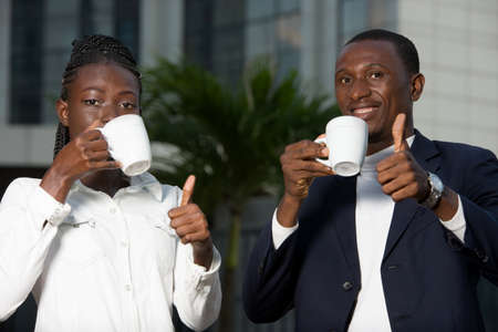 Tired, overworked black African drinking hot coffee, taking coffee brake