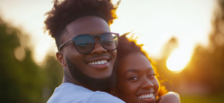 Joyful couple enjoying a moment in the park under the warm sunlight while embracing each other with smiles