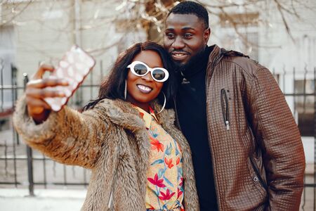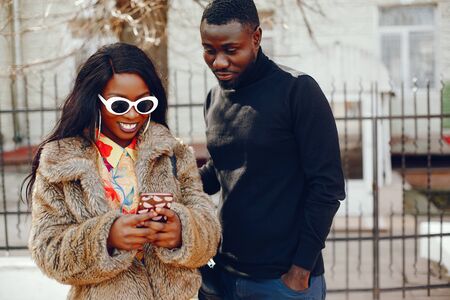 A young African American couple dressed fashionably enjoys each others company in the city, banner