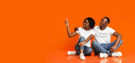 Happy black lovers sitting on floor, cuddling and looking together at copy space, orange studio background, panoramic photo. Smiling african american woman aiming aside at advertisement