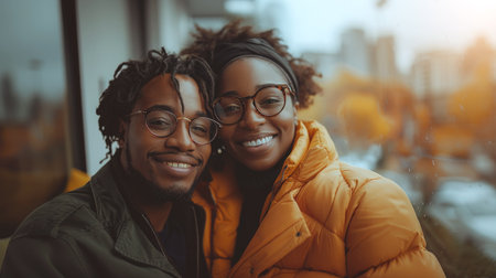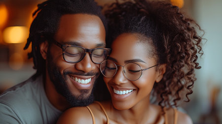 Portrait of a young African American couple smiling, close-up view with warm lighting and soft focus, ideal for diversity, relationship, and love themes.