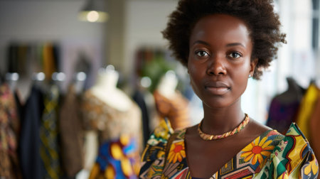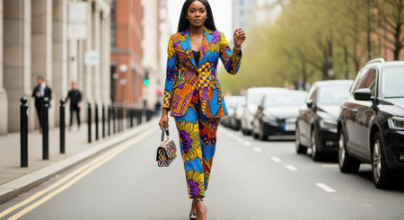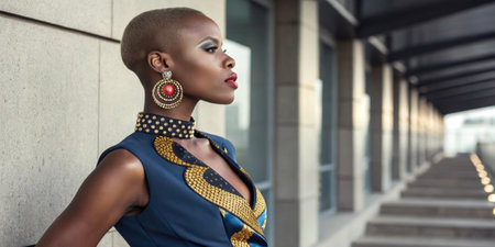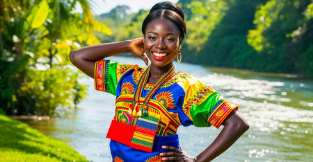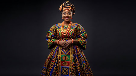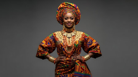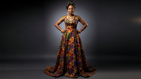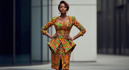 Elegant african female in traditional patterned dress standing confidently outdoors