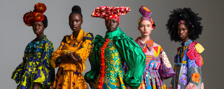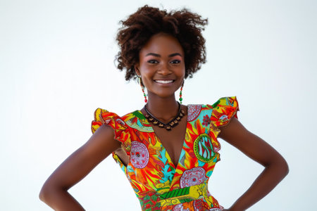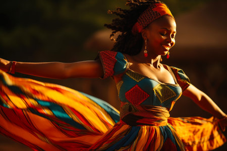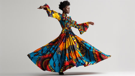 An African woman elegantly dressed in a vibrant, colorful traditional outfit, captured in motion. The flowing dress showcases intricate patterns and bold hues, reflecting the richness of African fashion and culture. Her poised stance and confident expression add to the dynamic and graceful composition. This image is perfect for themes related to ethnic fashion, cultural pride, dance, and traditional attire