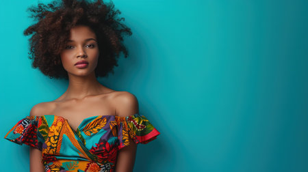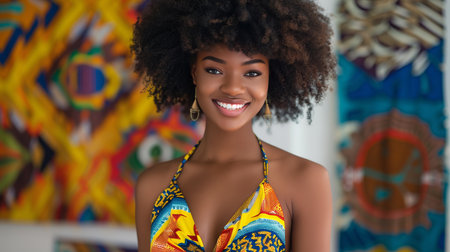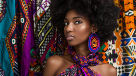 Stylish Woman with Afro Hairstyle and Traditional Patterned Fabric Background