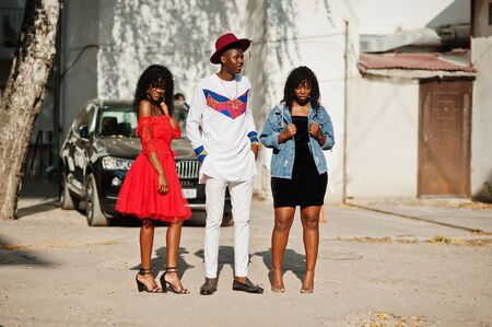 Group of three stylish trendy afro france friends posed at autumn day. Black african man model with two dark skinned womans.