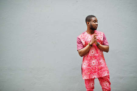 Portrait of a black young man wearing african traditional red colorful clothes.