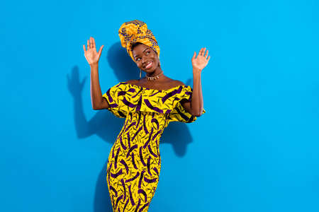 Photo of young happy smiling beautiful afro woman in turban yellow dress dancing isolated on blue color background