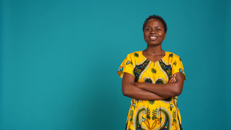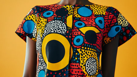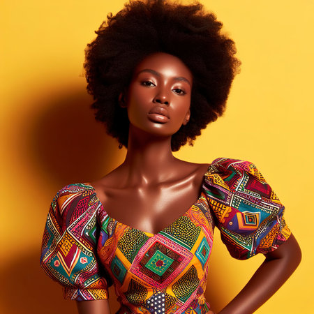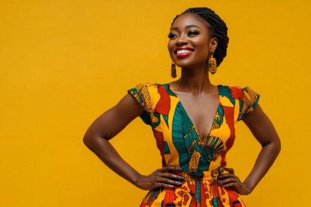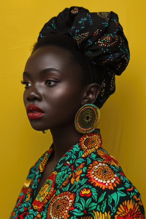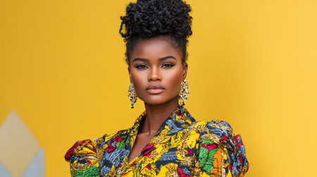 Portrait of a woman showcasing vibrant African fashion against a bright yellow background, captured in a studio setting during daylight