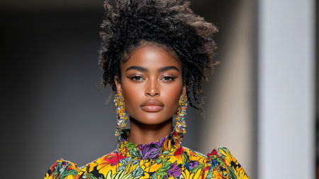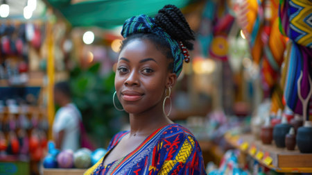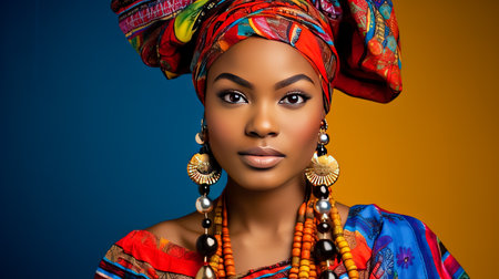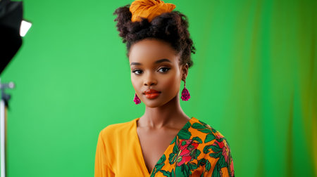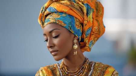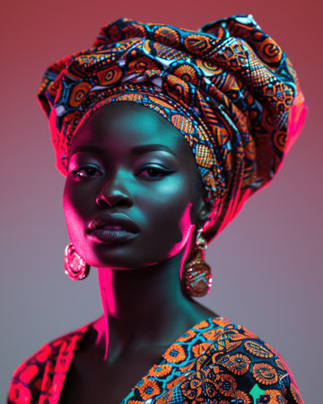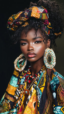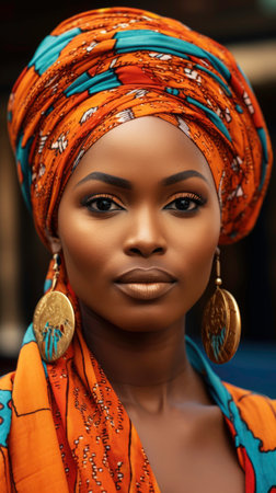 The subject emanates charisma with a striking outfit adorned in colorful patterns, large statement earrings, and a beautifully styled headwrap, embodied elegance and cultural richness.