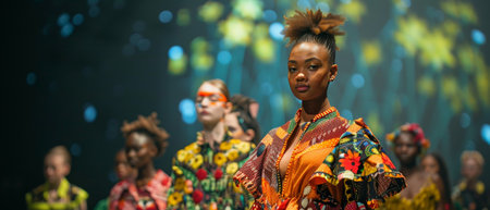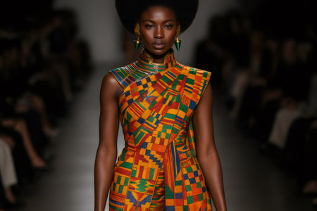 Fashion model walks the runway wearing a colorful, patterned Kente dress, highlighting African fashion and textile design
