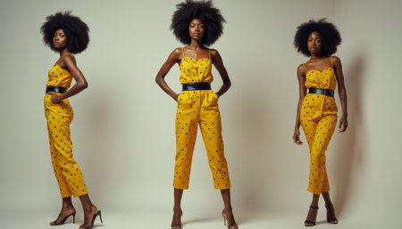 A stunning model with a voluminous afro poses in three stylish yellow jumpsuits, each adorned with playful black polka dots. The bold colors and chic designs highlight her confidence and fashion-forward attitude, making a striking statement in contemporary fashion.