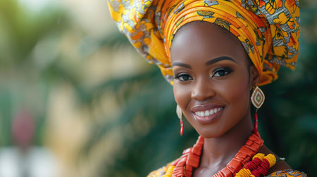 Portrait of a gorgeous black woman smiling brightly, dressed in vibrant traditional African attire, set against a softly blurred background.