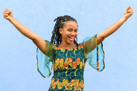 Attractive vivacious African American girl cheering and laughing and punching the sir with her fist as she celebrates outdoors