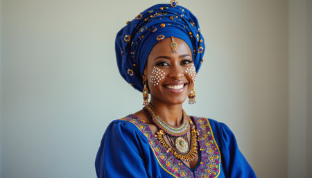 A stunning woman of African descent smiles brightly, adorned in a rich blue traditional outfit and an elaborate headwrap. Her striking jewelry and intricate facial markings celebrate cultural heritage and beauty, radiating joy and pride.