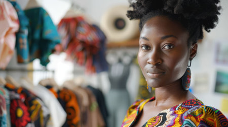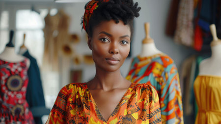 The picture of the african american female is working as fashion designer inside her own workshop, the fashion design also require skill like creativity, cultural awareness and time management. AIG43.