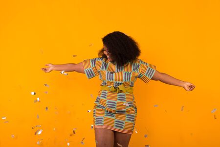 Party, holidays and birthday concept - Celebrating happiness, young woman dancing with big smile throwing confetti