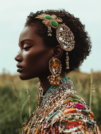 In this profile shot, a person adorned in beautifully detailed cultural attire stands amidst nature, highlighting exquisite jewelry and accessories that reflect cultural heritage and artistry.