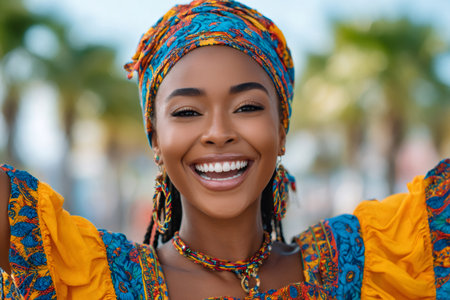 Portrait of a cheerful Brazilian woman with braids wearing a colorful turban and dress, representing the vibrant culture of Brazil