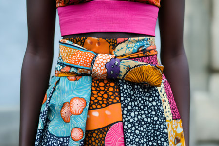 Black woman showcasing colorful patchwork textile with a tied waist detail and bold patterns
