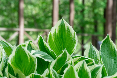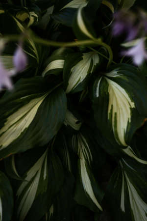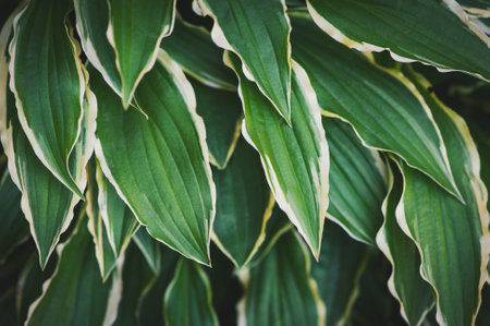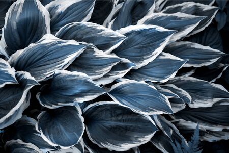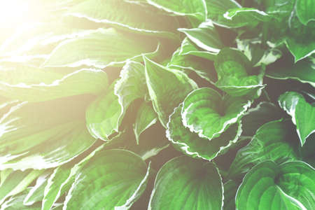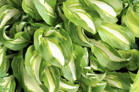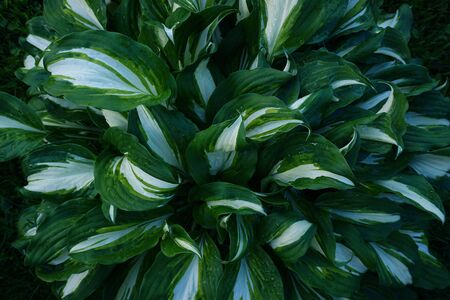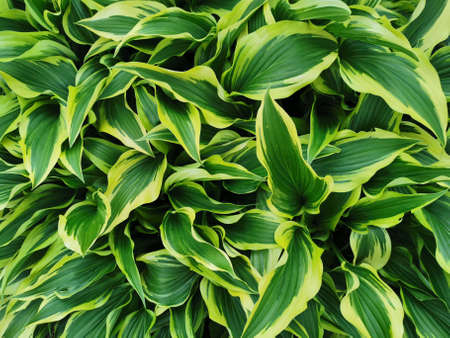 Natural background. Hosta (Funkia, Plantain Lilies) in the garden. Green leaves with white border