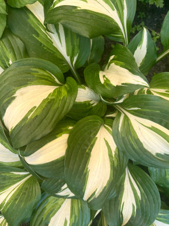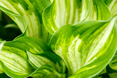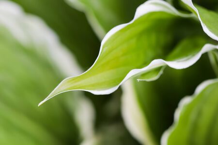 Green white leaves of hosta in garden close-up. Genus of perennial herbaceous plants of asparagus family. Shade-tolerant foliage in gardening and landscape design. Natural floral