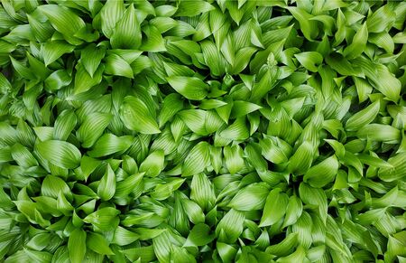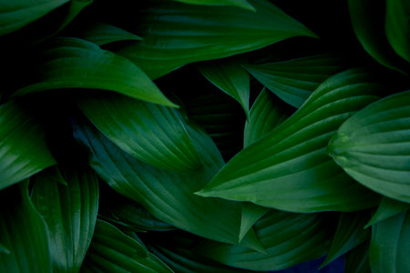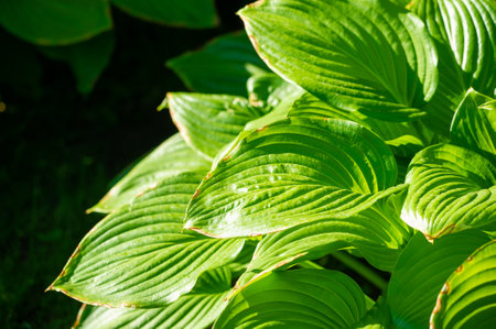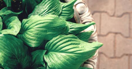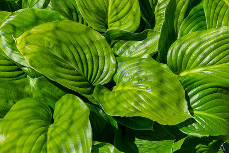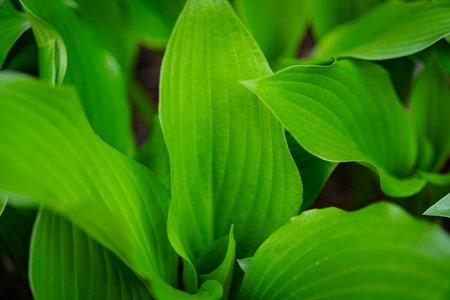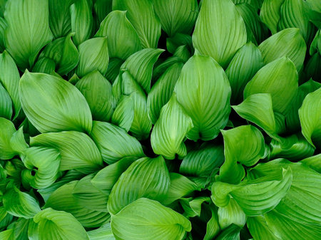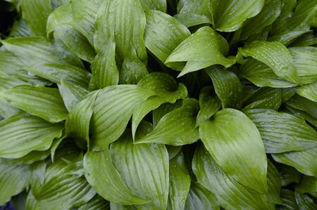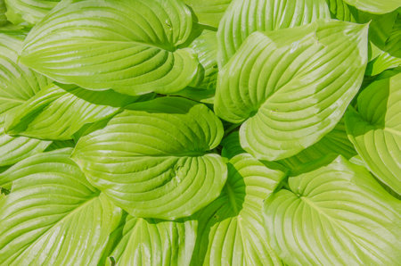 Minimalistic background with hosta leaves close - up view from above. The hosta leaves are a close-up of a bright green color. Beautiful large decorative leaves of an ever-green garden plant.