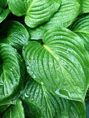 green leaves with dew drops and rain close up, rain concept, hosta leaves